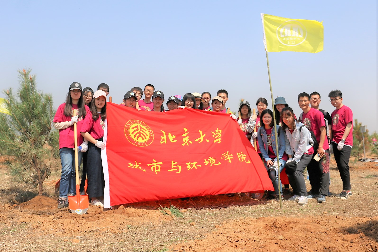 的志愿者们前往所在组植树区域,几人一组合力植树。尽管缺乏经验,但在关老师的指导下,同学们迅速掌握了科学的铲土方法。骄阳似火,同学们也干得热火朝天,铁锹挥动、泥土纷飞,大家按照铲土、填埋、夯土、浇水的流程,齐心协力种下一棵棵马尾松树苗。不少同学表示,想不到在北京市最重要水源基地的密云水库附近,还有这样荒芜待种的土地,他们今后将会更加关注水资源质量、关注我们的生存环境,并将更多投入到类似此次植树的环保活动中。 图4 活动合影 “绿水青山,就是金山银山。”值此世界地球日之际,同学们积极投入到植树活动中、增强爱绿植绿护绿意识、以实际行动践行环保,这正是“城环文化节”精神的生动彰显。改善生态环境,提升生活品质,需要我们携手并进——让我们植下一棵碧树,共赴蓝天绿水之约!