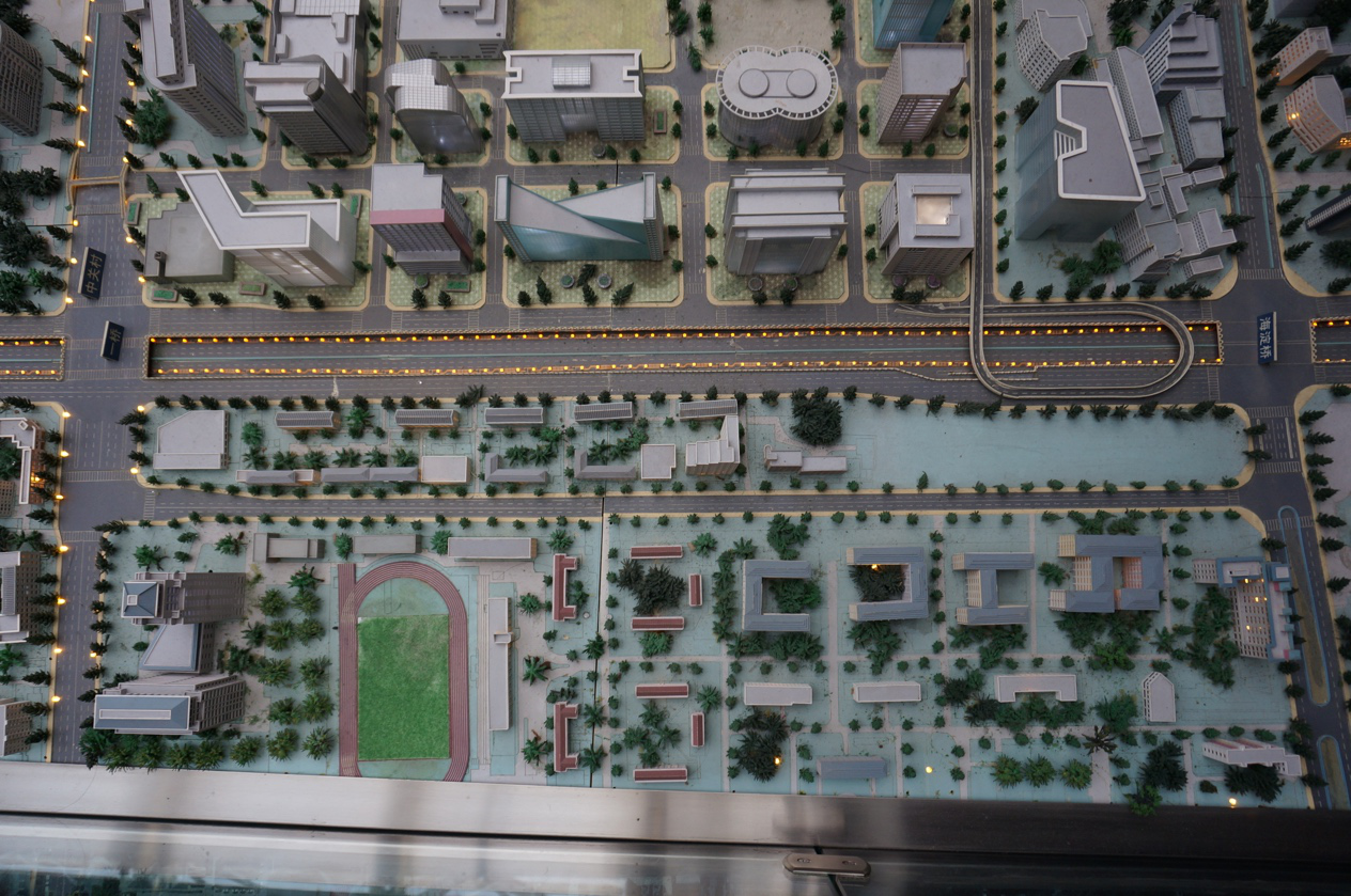 燕园校区及周边建筑的部分区域展览模型 在回顾历史后,我们更加关注的是现在和未来。在三层展厅中央的北京城市规划模型及周边遥感影像图为底图的地面上,同学们沿着四环路一路走到了金瓶梅在线