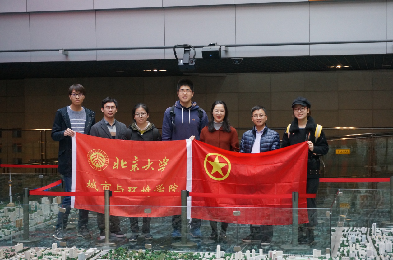 ,寻找着北大的教学楼、食堂、宿舍,以鸟瞰的视角领略着自己生活的空间。站在这里,同学们感受到,偌大的北京城不仅是学术中的研究对象,更是首都人民栖息的家园,紧密关系到首都的发展、国家的富强,关系到人民群众的切身利益。因此,作为规划师还要从书本和理论中走向实际,关注城市规划的整体结构与精彩细节。此外,北京西站、CBD、通惠河和高铁建设的模型等也引起了同学们的极大兴趣。 展厅中的低碳城市建设相关内容 在四层展厅,同学们参观了北京市海绵园区、绿色生态示范区、高端产业综合服务区、超低能耗建设成果等低碳城市建设情况。有同学表示,这些规划实践,与十八大五中全会提出的“创新、协调、绿色、开放、共享”五大发展理念高度契合,为我们指明了学习研究的努力方向。五大发展理念揭示发展规律,引领时代发展,丰富了中国特色社会主义理论宝库,也为规划师们在推进智慧城市和新型城镇化建设等方面提出了新启示与新要求。 回到学校后,同学们在理解最新版北京城市总体规划内容的基础上,采用分组讨论的方式学习研讨了十九大精神和习近平新时代中国特色社会主义思想。党的十九大报告指出,实施乡村振兴战略、区域协调发展战略,以疏解北京非首都功能为“牛鼻子”推动京津冀协同发展,高起点规划、高标准建设雄安新区,这是贯彻新发展理念,建设现代化经济体系的要求。习近平总书记视察北京工作时的强调,规划务必坚持以人为本,坚持可持续发展,坚持一切从实际出发,贯通历史现状未来,统筹人口资源环境,让历史文化与自然生态永续利用、与现代化建设交相辉映。城市规划在城市发展中起着重要引领作用。建设和管理好首都,是国家治理体系和治理能力现代化的重要内容。北京城市规划要把握好战略定位、空间格局、要素配置,坚持城乡统筹,落实“多规合一”,形成一本规划、一张蓝图,着力提升首都核心功能,做到服务保障能力同城市战略定位相适应,人口资源环境同城市战略定位相协调,城市布局同城市战略定位相一致,不断朝着建设国际一流的和谐宜居之都的目标前进。 城环青年在北京城市规划模型展区合影 在砥砺奋进的五年中,习近平总书记对北京的发展建设高度关切。当前和今后一个时期,北京市必须抓好城市规划建设,着眼精彩非凡卓越筹办好北京冬奥会,才能开创首都发展更加美好的明天。而习总书记在城市发展、城乡规划和生态文明建设等领域提纲挈领的指导性意见更值得每一位城环青年学习体会。举世瞩目的党的十九大隆重召开,习总书记作出“中国特色社会主义进入了新时代”的重大判断,向我们广大青年发出了奋进新时代、开启新征程的进军号令。考察学习北京市规划展览馆有助于同学们从专业领域更加深入地领悟习总书记新时代中国特色社会主义思想,进一步结合实践工作提升思想政治水平,强化政治意识、大局意识、核心意识、看齐意识,深刻认识到作为青年学子,自身发展和所学专业在总体布局中的作用。希望这次主题团日活动可以促进同学们成长为不忘初心、牢记使命的新时代青年学子,鼓励同学们在今后的学习和工作中为全面建成小康社会、全面建设社会主义现代化国家的新征程贡献青年一代的力量。
