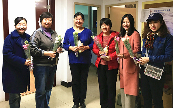 工会为学院女教职工精心准备了以“美丽绽放”为主题的三八节系列活动。 活动一:为“女神们”献上美丽的鲜花和小礼品 图1 节日礼物 3月7日,满载礼品、饱含爱意的工会小分队出现在逸夫贰楼,向每位女教师送去自制的贺卡、美丽的鲜花和暖心小礼品,同时致以节日的温馨祝福。收到礼物的老师个个洋溢着幸福的微笑,全院沉浸在一片欢声笑语,喜悦的节日氛围中。“美丽绽放”三八节系列活动以鲜花拉开序幕。 图2 每位老师都洋溢着幸福的微笑 活动二:组队参加北大女教职工“环湖接力跑”活动 3月8日中午,学院组队参加了由金瓶梅在线
