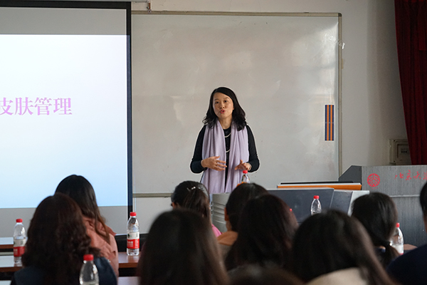 女教职工环湖接力跑”活动。 图3 跑步起点 图4:集合时的合影 上场前,平日端庄娴静的女教师们迅速变身运动员,个个跃跃欲试,神采飞扬,进行着拉伸等准备活动,现场气氛十分热烈。 图5 我们是运动员 跑步过程中,每组的老师协作配合,完美地完成了每一棒的交接。大家奔跑在美丽的未名湖边,沐浴着温暖的阳光、呼吸着新鲜的空气,以积极的心态迎接自己的节日、享受运动的魅力。 图6 让我们跑起来 此次活动不仅缓解了大家紧张繁忙的工作压力,更重要的是增强了团队的凝聚力,促进了老师们之间的交流和感情,让老师们在运动中绽放美丽,而节日的惊喜还在继续。 图7:跑步后的合影 活动三:现代女性日常皮肤管理及美妆课堂 作为“女神”当然要时刻美美的,3月8日下午,学院工会专门组织了“现代女性日常皮肤管理及美妆讲座”,特别邀请了毕业于法国巴黎Christian Chauveau彩妆学校,现任专业美妆培训师的塔塔老师为大家讲授。 图8 学院工会副主席刘萍老师主持 课堂中,塔塔老师重点向大家介绍了皮肤管理知识,包括日常护肤程序及注意事项、不同的皮肤类型如何针对性的进行护理及选择合适的化妆品、深层皮肤护理的类型和优缺点;随后又给大家介绍了彩妆技巧,日常彩妆的画法。 图8 塔塔老师授课 整个课堂气氛活跃,大家不仅认真听讲还默默记录,不时提问请教,生怕错过每一个可以变美的小细节。参加活动的老师纷纷表示通过讲座学习到了许多颠覆传统认知的新知识,改变了一些护肤理念。原本一个半小时的讲座一直延长到两个小时才圆满结束,足见大家的高涨热情,最后学院工会副主席刘萍老师表示今后会找机会,继续邀请塔塔老师开展系列讲座,让金瓶梅在线