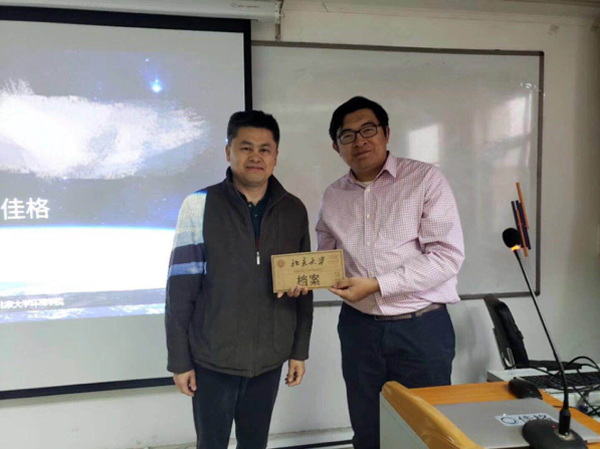 教授陈效逑、副教授彭建,团委书记、学生工作办公室主任王宇凡出席活动。活动吸引了全院本硕博各专业同学参加。 图一.陈效逑教授向张弓院友赠送纪念品 讲座伊始,由王宇凡简单介绍了分享院友。张弓博士是学院2004级地理学硕士、美国犹他州立大学博士。接着,张弓博士当年的导师陈效逑教授代表学院向他赠送了金瓶梅在线