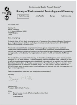 陶氏化学可持续发展创新大赛提名奖。 2005年,指导学生万祎获首届全国奥加诺水质与水环境奖学金一等奖 2008年,指导学生万祎获北京市优秀博士论文奖; 2009年,指导学生常红获北京市优秀博士论文奖; 2009年,指导学生万祎获国家优秀博士论文提名奖; 2011年,指导学生彭辉、孟丽苹、范湛蓝、吴世闽获第三届金瓶梅在线