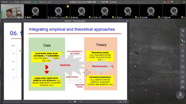 2020年春季学期开学。全体城环人在学校与学院的部署下顺利实现延期返校,按时上学的教学目标。我们将通过这篇新闻记录这段特殊的历史时期。 一、课堂速览 开课之前,先来段自我介绍 城市规划与公共健康 授课教师马亮 助教王宏宇 上课开始!有这种微信群线上交流的基本款 经济地理学进展 授课教师贺灿飞 助教汤慧桢 还有大家一起看录像的升级版 生态学研究进展 授课教师刘鸿雁 助教赫文琦 还有认真化妆以后却忍痛关掉摄像头专心只看老师的 发展战略与区域开发 授课教师李双成 助教张雅娟 生态统计方法 授课教师王少鹏 助教罗明宇 或者与老师相看两不厌的 土地科学原理 授课教师蒙吉军 助教程浩然 以及老师觉得你懂了但你没懂只能疯狂给大佬刷“问题”打call的 生态学技术与方法 授课教师王志恒 助教李亦超 最后是学生发言环节(一定要保持微笑) 城市社会专题 授课教师柴彦威 助教李彦熙 二、教师采访 网络实时课程对学生来说也许只是换了一个看直播的平台,对老师来说却是从教以来一次巨大的挑战。课后我们及时采访了几位老师,来看看他们的感想吧! 生态学研究进展 刘鸿雁 : 全新形式的课堂、特殊时期的授课,对于我而言是一次很难得的经历,学校和学院给予了很多帮助,包括线上网络培训、微信群的反馈等。为了网课(植物学),我提前工作了一个多星期,事先实验了三个系统,担心黑屏又预录了语音课程,准确地预测了教学网拥堵,最后果断地采用了腾讯会议系统,总之是一次新奇而精彩的经历,仿佛迎接一场大考。我感到因为疫情和学生们的空间距离更远了;因为网课,我和这些“网络原住民”的心灵距离,却更近了。 疫情不能阻止学习的脚步和科研的热情,希望每一位同学利用好在家学习的契机,合理利用时间。同时建议大家网络上课期间打开摄像头,便于教师看到学生的表情,对学生的状态做出判断,实时调整教学进度。最后让我们共同期待疫情的胜利和返校的相聚! 土地科学原理 蒙吉军: 说实话,对于上网络课程,我之前是排斥的,因为总觉得自己不善于出镜,在镜头前会紧张,担心讲课会发挥不好。但接到学校延期的通知后,我就决定这学期开设的课程均采用在线方式教学,不影响教学进度和效果。 因为是第一次上网课,脑海里设想了很多上课的情景,甚至像表演似的设计好了一些重要环节合适的台词。另外,还对自己身后背景进行了专门的布局,摆放了一盆高大的绿植,并选择了光线最佳的视频拍摄角度和自己座位的最适高度,最后上课的时候还穿了正装。总的来说,我感觉第一次网课还是非常成功的,也感谢所有选课同学的配合和助教的辛勤付出。 最后希望同学们不要恐慌,遵守国家、社区防疫的要求,尽量少出门,出门一定戴口罩,做到不聚会、勤洗手。防疫的同时,也要不耽误学习和科研,希望同学们在家合理安排时间,争取使灾害造成的影响最小化。 全球变化生态学 朱彪 我使用腾讯会议上课,除了看不到学生之外,效果还不错,最后留些时间与学生互动,没有什么困难。网课对课堂效果肯定有影响,与学生的眼神交流比较困难,也没有学生的第一时间反馈和互动;在课程最后留出时间与学生语音互动,提问回答,有部分弥补作用。希望大家不要放松学业,在家注意锻炼和饮食,做好防护,有问题多与任课教师或自己导师沟通,把疫情的影响降到最低。 三、后勤保障 开学第一周顺利完成教学任务不仅源于老师的精心准备,也离不开学院的后勤保障。为此我们采访了学院教务老师于佳鑫,详细了解开学第一周背后的故事: 研究生教务这边的工作主要分成三个部分,招生、培养和学位 。从疫情爆发以来,根据学校和学院的工作安排,全体老师就开始在线上开展工作。关于课程方面,我的主要工作就是全力保证课程的顺利进行。具体来说,2月6日学校给全体教务人员开会布置工作,我在2月7日将学校的精神传达给学院的老师们,本学期预计开设46门研究生课程,我都逐一去跟老师沟通,了解他们想用什么样的方式去授课。一开始,部分老师因为担心授课效果受影响,对网络授课的形式还不是很接受。根据学校和学院的安排,本学期网络授课期间,每门课程均配备1名助教,协助老师们准备课程。在研究生院、教发中心、学院老师们和助教们的共同努力下,最终各位老师根据课程特点选择了最合适的授课方式。 所有课程的授课方式确定后,2月14日我给全体研究生同学发邮件通知。因为大家都是第一次遇到特殊情况,难免会有各种疑问,那几天我就一直守在电脑前面回复邮件。开课后我这边也是随时在关注课程效果,收集每天课程的教学情况反馈。 这个过程中有很多比较有趣或感人的事,其中有一件我印象特别深,就是网络并没有影响大家上课的积极性,反而好像更积极了。有两门课程的老师跟我提出希望再增加选课人数上限,因为课程容量是根据去年数据定的,今年选课人数多了不少,有部分学生没选上课然后问能不能增加。我觉得宅在家,让同学们学习的积极性就更高了。也希望没课的同学们好好准备综合考试、开题和毕业论文,减少疫情对大家学业的影响。 我们还采访了部分助教,来看看他们的付出吧: 土地科学原理助教 程浩然: 第一次担任助教,就遇上了“云教学”这种特殊的形式,新奇之余更多的是紧张。在接受了全面的在线教学培训,并情景