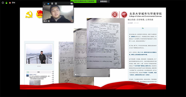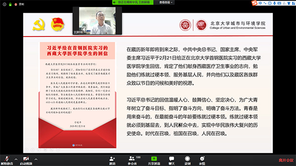 采用线上会议的方式举办了“‘城’心抗疫,环抱未来”党团日主题活动。学院党委书记刘耕年,党委副书记张新平,团委书记、学生工作办公室主任王宇凡,团委常务副书记、专职辅导员周伟,学生办公室副主任柴腾出席。学院2018届毕业生、湖北省宜昌市远安县洋坪镇挂职副镇长上官淮亮作为特别嘉宾出席。学院党支书、团学研骨干、第34期党性教育读书班成员、团支书培训“领雁”计划学员及“城帜”团校学员共161人参与活动。活动由王宇凡主持。 活动开始前,与会师生跟随2019级本科1班团支部制作的《同“心”战“疫”》视频一起为湖北和中国加油。刘耕年带来一堂别开生面的党课。他结合2月23日习近平总书记在统筹推进新冠肺炎疫情防控和经济社会发展工作部署会议上的讲话讲解了当前防疫形势和党的领导下统筹推进疫情防控和经济社会发展工作的重要举措,介绍了近期北大人在疫情防控中的工作情况和学院防疫工作一系列举措。他为同学们讲解了习近平总书记2月21日给正在金瓶梅在线