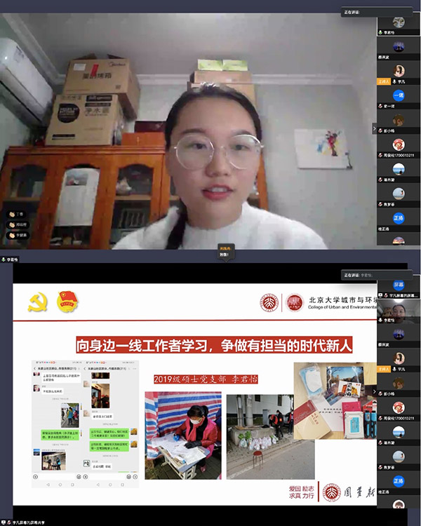 援鄂医疗队“90后”党员的回信,结合总书记一个月内两次给北大、给青年的回信分享了他的几点感受。他认为,一线的白衣战士是最可爱的人,他们冲锋在前、英勇善战,忘我投入、争分夺秒与病魔抢夺生机。他指出,“奋斗的青春最美丽”,在这次抗击疫情的斗争中,在各条战线上坚守岗位、勇敢逆行的“90后”“00后”挺身而出、担当奉献,充分展现了新时代青年的精神风貌。同时他表示,“组织的力量最强大”,在一线,是组织的力量才能把大家迅速凝聚在一起,形成一支召之即来、来之既战、战之能胜的队伍。希望同学们都能以战疫一线工作的青年为榜样,练就过硬本领,主动挑起为国为民的重担。 图5 党委书记刘耕年讲党课 随后,学院参与战疫志愿服务工作的青年代表发言。2018级硕士自然班团支部书记王雨频分享了自己参加线上辅导志愿工作的经历。她认为青年一代正在成长为国家社会的中坚力量,要不负总书记的殷殷嘱托,磨练意志、提升本领、勇担责任,让青春之花绽放在党和人民最需要的地方。2018级硕士自然班团支部杨怀志介绍了自己参加社区防疫志愿服务的经历,他跟着父亲一起负责183位教职工和3500余个学生的近期出行统计情况,排查病疫风险,为学校的学生的保驾护航。他表示,一面党旗就是一座堡垒,越是在关键时刻,越需要党员冲锋在前。 国庆重大活动方阵候补队员、学生疫情防控专员、2018级博士班班长董立铮表示,战疫打响以来,他以“有担当”为目标,每天在学生群里发布问卷并发起疫情接龙,实时了解全班同学的健康状况。从国庆70周年群众游行方阵候补队员,到如今的学院防疫工作学生专员,他认为,国之召唤,使命必达,用青春小我奉献国之大家,是新时代青年人的责任和承诺。 两位湖北同学各自介绍了家人在战疫一线工作的事迹。国庆70周年群众游行方阵队员、2018级本科城规班团支部余犀雨的母亲是襄阳市第一人民医院病理科主任医师,她和同事争分夺秒地对新冠肺炎患者的组织进行采样,取材、固定、包埋、切片、染色、显微镜观察。这次疫情让余犀雨看到了医护工作者的无私与伟大。同时他也回忆起参加国庆70周年群众游行训练中身边的青年党员、团员冲锋在前的担当,他表示,青年人要向这些优秀榜样学习,时刻准备好为人民挺身而出、勇往直前。2019级硕士党支部的李君怡用“感动、辛苦、焦虑、欣慰”四个关键词讲述了身在武汉的一家人参与社区一线防疫工作的感人事迹:为邻里间互助互爱、令人感动而感动;为道路难走、早出晚归而辛苦;为无证人员不听劝阻、担心自己感染病毒并进行传染而焦虑;为守职期间群众们的支持和感激而欣慰。通过这次疫情,她也更深切地体会到青年学子的本职和担当。李君怡发言后,与会所有师生集体鼓掌向武汉人民致敬,为武汉人民加油。 图5 李君怡介绍家人在武汉社区防疫一线工作情况会议 最后,学院党委副书记张新平对学院每一位参与抗击疫情的同学表示感谢,希望大家再接再厉,深入学习总书记的回信精神,将总书记对青年的期待内化于心,外化于行,展现北大青年应有的面貌。张新平强调,虽然目前国内疫情形势向好,但在关键时刻更不能放下警惕,同学们要继续服从大局、严格遵守规定,学校和学院会为同学们做好各方面的服务保障,陪伴大家一起度过这段特殊时期。 图7 学院党委副书记张新平总结讲话 从国庆70周年重大活动到而今举国同心战疫,国之盛典上有北大青年昂扬身姿,国之重任中亦有北大青年坚强臂膀。“青年一代有理想、有本领、有担当,国家就有前途,民族就有希望。” 3月15日以来,金瓶梅在线