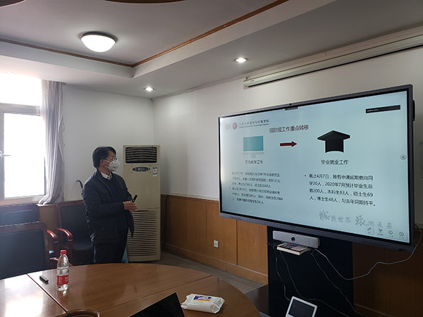 院长贺灿飞,党委书记刘耕年,副院长李本纲、李双成、金鑫,党委副书记张新平出席会议,学院全体导师远程参加视频会议。 图 视频会议 李本纲对学院本科生期末考试、论文答辩、毕业审查等工作方案进行详细解读。学院本科教学各项工作按照校历时间,有序推进。任课老师确定期末考试方式或预案,与选课学生做好沟通;论文指导老师持续关注学生论文进度,坚持论文严格要求,同时明确论文提交、论文答辩的时间,做好论文答辩预案准备;教务办公室严格按照教学计划核查学生学分,做好毕业审查工作。李双成结合学校2020毕业工作推进会会议精神详细介绍了学校和学院推进2020毕业生论文撰写、答辩、评审和学位授予等重点工作的系统方案。学院在学校总体工作部署的指导下,结合学院研究生毕业生切实需求,在保证严肃性、规范性的前提下制定了适合学科特点的方案。学院导师们根据自己指导研究生实际情况和遇到困难积极提出完善建议,增强了方案的可实施性。 张新平介绍了学院2020届毕业生就业进展和未落实毕业去向同学情况报。学院自2月初以来开展多轮全覆盖毕业进展摸排,并协助学生及时办理毕业生就业推荐表、三方协议书申领等就业手续。针对受疫情影响未落实毕业去向同学开展了“敲门行动”,一对一、手把手定向推荐岗位,开展分行业、分领域求职指导,积极联系用人单位进行内部推荐。未来还将开展校友专场招聘活动,与研究生导师、校友多方联动帮扶就业困难同学。 贺灿飞在总结发言中首先对全体教师表示感谢。疫情爆发以来,学院全体教师坚守立德树人初心,投入百倍精力认真开展网络教学、悉心指导学生,履行着教书育人的神圣使命,是“延期不停教、延期不停学、延期不停研”最为有力的保障。学校高度关注毕业工作,采取各项措施全力推进毕业工作,为学生顺利毕业提供有力保障。围绕疫情期间毕业工作的重点,贺灿飞强调,要服务防疫工作大局,切实增强做好毕业工作的责任感和使命感,尽最大努力帮助学生顺利度过这个特殊的毕业季。 图 贺灿飞总结发言 接下来,学院将全力以赴做好2020毕业生工作。导师、教学、行政、学工等多方联动、紧密配合,系统推进毕业生论文撰写、答辩、评审以及毕业生求职等重点工作。学院也将继续完善毕业困难学生“一人一策”解决方案,加强对学生的关爱和指导,联动院友资源,多方拓展就业渠道,争取实现百分之百充分就业,营造特殊时期最暖毕业季。