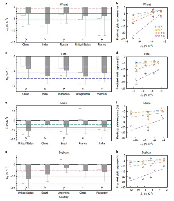 气候变暖对粮食安全的影响是实现可持续发展目标的重要挑战,受到科学界和各国政府的高度关注。然而全球和国家尺度上作物产量对气候变暖的响应仍然存在很大的不确定。以往研究发现不同研究手段估计的气候变暖对全球作物产量的影响的差别可以达到3倍以上,因此政府间气候变化专门委员会(IPCC)的评估报告对气候变暖导致的产量变化只能给出定性的结论。如何提高未来气候变暖对全球作物产量的评估精度是全球变化领域普遍关注的研究热点问题。 王旭辉研究员的研究团队通过设计贝叶斯条件概率统计方法,将全球48个增温实验数据与全球作物模型相结合,重新评估了四种主要粮食作物对气温上升的响应。研究结果表明,1摄氏度的升温将导致小麦、水稻、玉米和大豆分别减产 2.9±2.3%, 5.6±2.0%, 7.1±2.8%和10.6±5.8%。相较于全球作物模型的估计,这一新方法克服了增温实验数量较少空间代表性有限的局限性和作物模型过程和参数的不确定性,将评估精度提高了12%–54%,大幅修正了增温导致全球小麦减产的幅度(较以往研究降低50%)。文章进一步指出,未来气候变暖将导致各主要产粮国的粮食产量普遍降低。但在同样的增温幅度下,美国和印度的作物产量减少幅度将比中国更大(图1)。即便实现《巴黎协定》约定的将全球平均气温较前工业化时期上升幅度控制在2摄氏度,全球四种主要粮食作物仍将减产3%-13%。该研究为推动全球和区域尺度作物模型的完善以及为后《巴黎协定》时期缓解与适应气候变化的政策制定提供了有效的依据。 图1 主要粮食生产国对气温上升的响应 该研究成果以“Emergent constraint on crop yield response to warmer temperature from field experiments”为题发表于《自然—可持续发展》(Nature Sustainability)杂志。金瓶梅在线