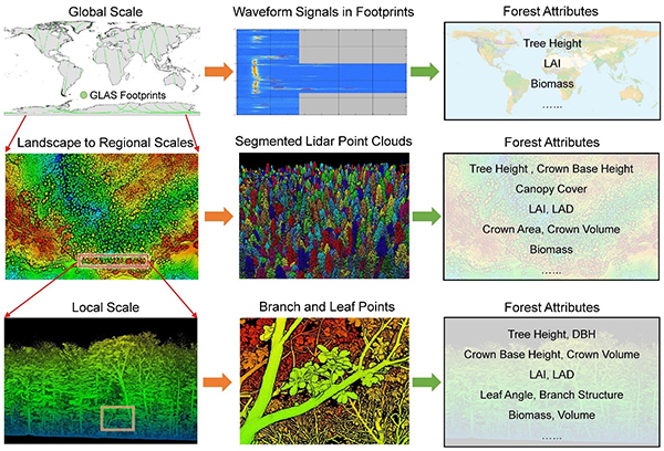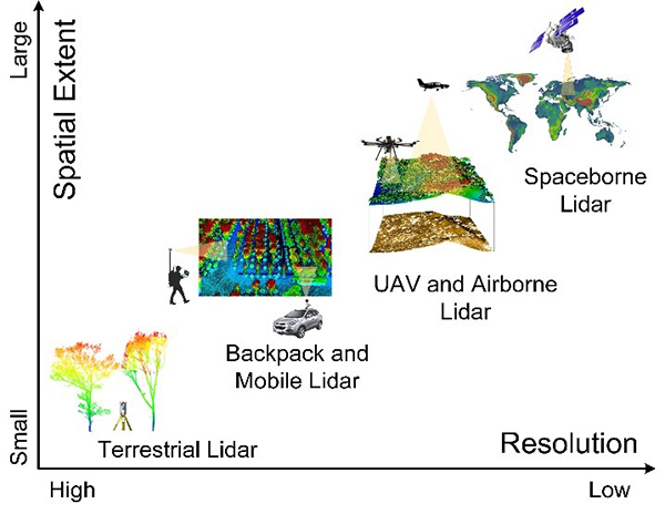 郭庆华教授、中国科学院植物研究所苏艳军副研究员为论文共同第一作者和共同通讯作者。该研究得到了中国科学院战略性科技先导专项(A类)、国家重点研发计划、中国科学院前沿科学重点研究计划和国家自然科学基金等项目资助。 文章链接://ieeexplore.ieee.org/document/9309060 不同激光雷达平台的空间分辨率与覆盖范围 基于激光雷达技术的森林参数的跨尺度估算