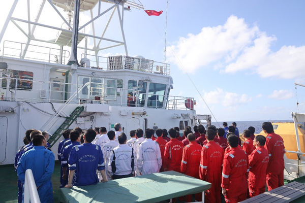 北京时间2021年1月1日上午8点,国家自然基金重大项目“西北太平洋地球多圈层相互作用”NORC-581航次的全体研究人员和船员们在登艇甲板上举行了一次特别的升旗仪式。伴着国歌,国旗徐徐升起,迎风飘扬,大家行着注目礼,内心的庄严感与使命感油然而生,航行在西太平洋上,我们仍与祖国连在一起!中共十八大报告提出,提高海洋资源开发能力,发展海洋经济,保护海洋生态环境,坚决维护国家海洋权益,建设海洋强国,这是中国特色社会主义事业的重要组成部分。我们要提高海洋科技自主创新能力,跟踪和探索海洋领域的重大科学问题,提高勘探开发海洋资源的水平,加快建设海洋强国。而如今,我们也希望能够通过自己的从事的海洋相关研究为我国海洋强国的建设贡献一份力量。 图1 元旦升旗仪式 在马里亚纳海沟连续作业20天后,本航次的科研任务已完成大半,“科学”号开始向北返航。但参与航次的四位同学(金瓶梅在线
