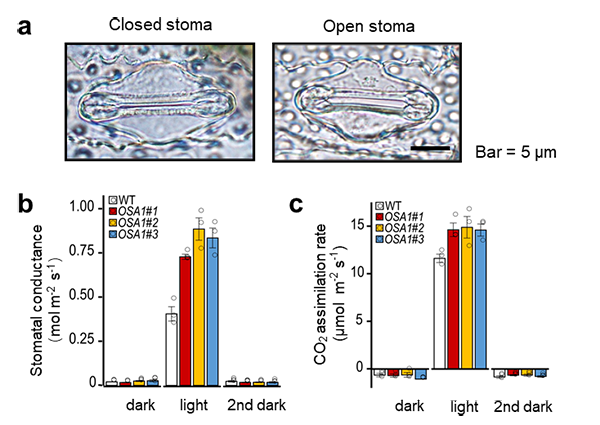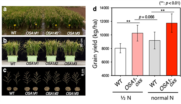 生态研究中心王愔研究员与其合作者经过5年多的研究,通过多地区多年次的大田实验,成功地进行了精准调控气孔开闭和促进根系养分吸收相结合的水稻基因改良,实现了产量与养分利用效率的双提升。该项成果不仅为提高作物产量,缓解粮食危机提供了新途径;也为提高农作物和植物的光合能力,增加植被碳汇潜力缓解全球变暖提供了新思路;更重要的是,该成果在实现增产的同时提高肥料利用效率,为减少由化肥使用带来的能源消耗和环境污染提供了新的启示。 王愔研究员一直致力于气孔调控与植物光合作用能力改善的研究。气孔是植物体表面的微孔,是二氧化碳和水蒸气等气体进出植物体的通道。气孔开闭以及开放的大小、快慢都会直接影响植物体内部的二氧化碳含量,进而影响光合作用的碳同化效率,因此气孔调控对于植物的光合作用十分重要。王愔研究员在攻读博士学位期间就开始从事气孔调控的基础理论研究,在草本植物叶片气孔对单色光响应方面取得了突破性的进展。之后,她应用模式植物拟南芥,率先提出了通过精准调控气孔开闭提高植物光合作用效率和生物量的新方法(Wang et al., 2014, PNAS, //doi.org/10.1073/pnas.1305438111),引起国内外的广泛关注。今次的成果是她与其合作者把先前的基础理论性成果成功地拓展到农作物的新突破。 图1. 改良后水稻的气孔导度与光合作用速率显著提升 a, 水稻气孔保卫细胞开闭时的形态;b, 在光/暗条件下,改良型与野生型水稻的气孔导度差异;c, 在光/暗条件下,改良型与野生型水稻的光合作用速率差异。(图中,WT为野生型水稻;OSA1#1~#3为改良型水稻。) 图2. 大田实验结果显示改良型水稻的产量和养分利用效率均显著提高 a~c, 大田实验中改良型与野生型水稻的生长、稻穗形态以及种子产量的比较图(其中,WT为野生型水稻;OSA1#1~#3为改良型水稻);d, 在正常施肥或施肥量减半的条件下,改良型与野生型水稻的产量比较(其中,WT为野生型水稻;OSA1-oxs为3种改良型水稻的平均结果。) 近年来,由于全球人口的增加和城市化进程的加剧,无论是提高全球粮食产量还是增加植被吸收二氧化碳缓解全球变暖,都面临着土地不足的限制,因此,通过技术手段提高植物光合能力就被寄予厚望。另一方面,长期大量使用化肥使作物对养分吸收和利用效率都在逐渐饱和,同时还会造成土壤退化和环境污染,因此越来越迫切地需要提高作物的养分吸收能力和利用效率。本项研究成果同时解决了上述两个方面的问题,为今后同时解决多重生态环境问题开辟了颇具魅力的研究方向。 该成果于2021年2月2日在《自然-通讯》(Nature Communications)杂志正式发表。金瓶梅在线