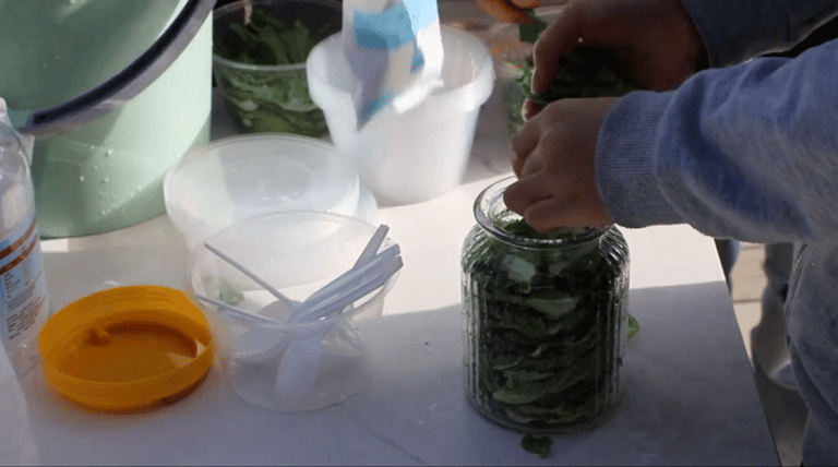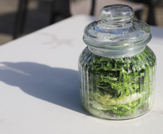 另一批则被用作了“辣白菜”的原料。在筛选和清洗之后,一层白菜一层盐,析出水分,密封后置于阴凉处,先给美味一点沉淀的时间。待水分析出、将表面盐分洗去后,便是辣酱的均匀涂抹、分装成盒。涂抹时,空气中香气四溢(以至于做辣白菜的同学们不时地忍不住偷尝一片)。一盒盒美味使人垂涎欲滴,俱是人间烟火气。